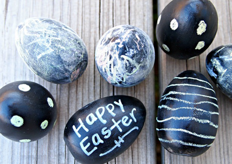 2. Интересен начин да сте различни на Великден, особено ако сте учител, е да направите яйцата си като дъска за писане – вземете си акрилна боя, която превръща повърхностите в "черна дъска" (предлага се в повечето магазини за художествени материали и големи супермаркети). След като яйцата изсъхнат, вземете бял или цветен тебешир и нарисувайте каквото поискате. Не се притеснявайте, ако сбъркате или резултатът не Ви харесва – може да изтриете с мокра кърпичка и да нарисувате друго.