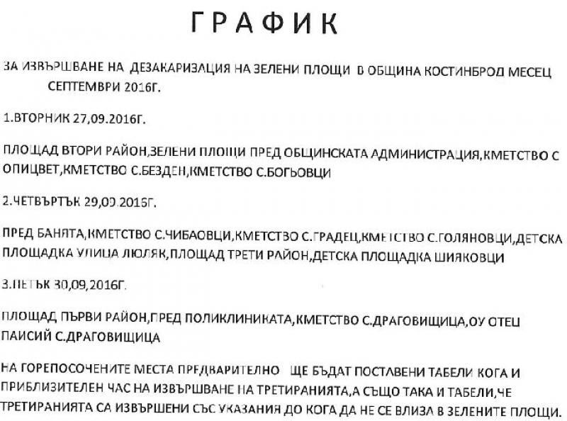 Графикът, по дни и места, по който ще се проведе дезакаризацията може да бъде открит на сайта на община Костинброд.