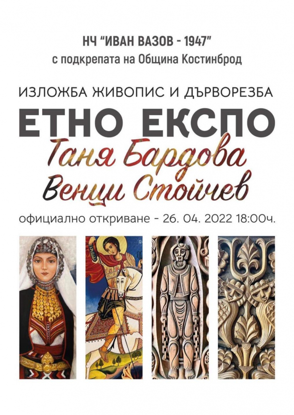 Изложба живопис и дърворезба „Етно ЕКСПО“ ще бъде представена в НЧ „Иван Вазов-1947“, гр. Костиброд. Експозицията ще бъде официално открита на 26 април от 18:00 ч. В изложбата ще бъдат представени творби на  Таня Бардова и Венци Стойчев.
