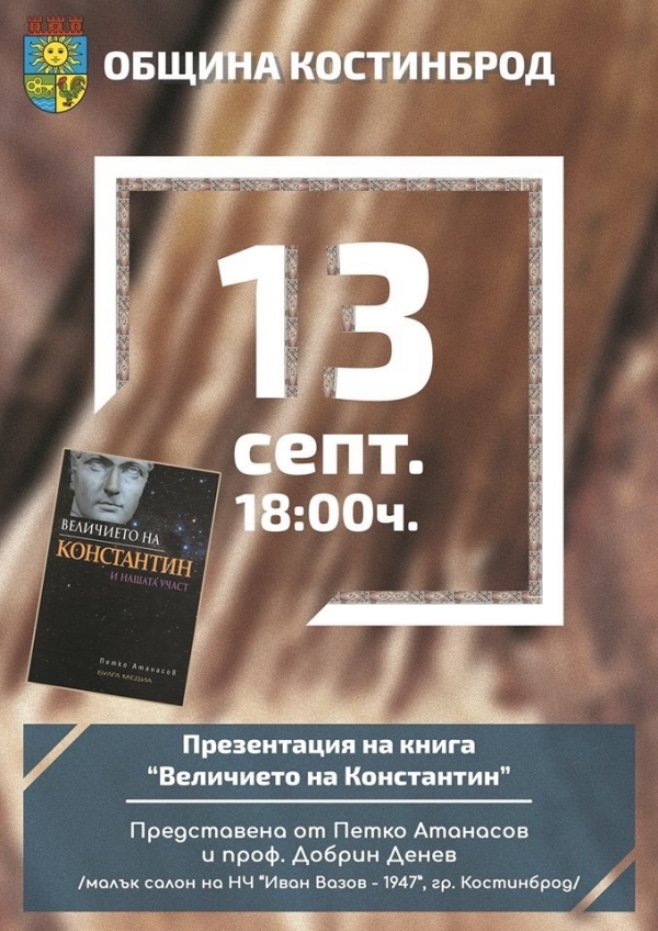От 18:00 часа пък ще се състои представянето на книгата „Величието на Константин“. За нея ще разкажат Петко Атанасов и проф. Добрин Денев.