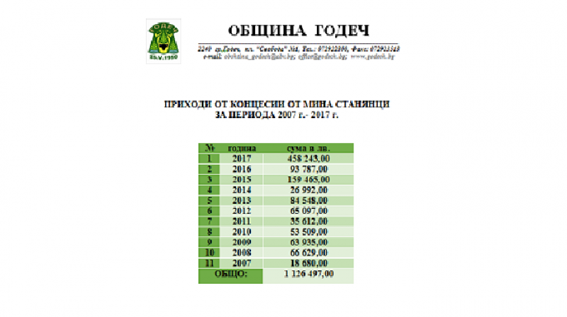 Предоставяме работни места за жителите на град Годеч (заедно с контрагентите около 200). Съгласно сключен концесионен договор с Министерството на енергетиката за добив на въглища- 50% от годишното възнаграждение плащано към Министерството, постъпва в бюджета на Общината.