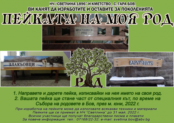 С родолюбивата инициатива „Пейката на моя род“, НЧ „Светлина-1896” и Кметство Гара Бов, за поредна година предизвикват всички родолюбци да направя и дарят пейка, изписвайки на нея името на своя род.