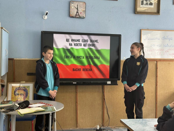Ученици от 7. клас представиха електронни презентации за Любен Каравелов, Георги С. Раковски и Васил Левски – идеолози на борбата за освобождение, като онагледиха живота и делата им. Историята и литературата се сляха в произведенията на Христо Ботев – „Обесването на Васил Левски“ и „Хаджи Димитър“ – като подкрепа на тезата за саможертвата, дълга и цената на свободата.