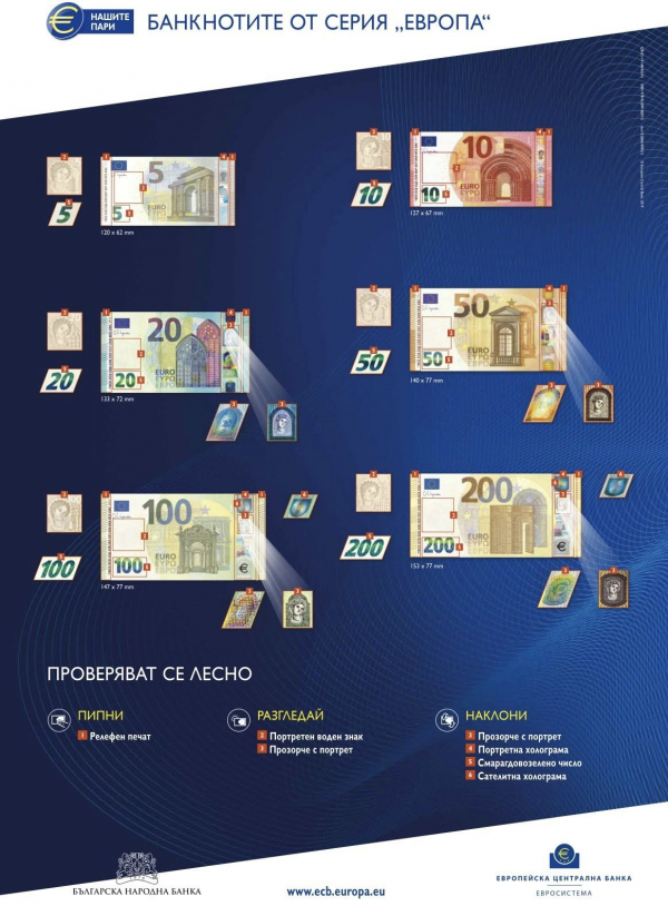 Българската народна банка съвместно с Европейската централна банка, са подготвили информационни материали, предназначени за запознаване на обществеността с дизайна и защитните елементи на евробанкнотите.