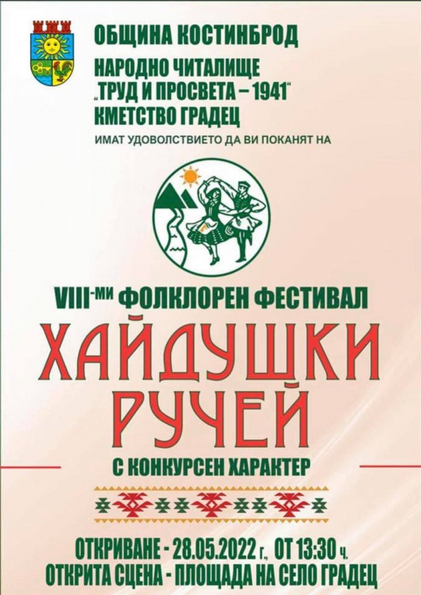На 28.05.2022 г. от 13.30 ч., в с. Градец ще се проведе фолклорен фестивал „Хайдушки ручей“, организиран съвместно от НЧ „Труд и просвета 1941“, Кметство Градец и подкрепен от Община Костинброд.
