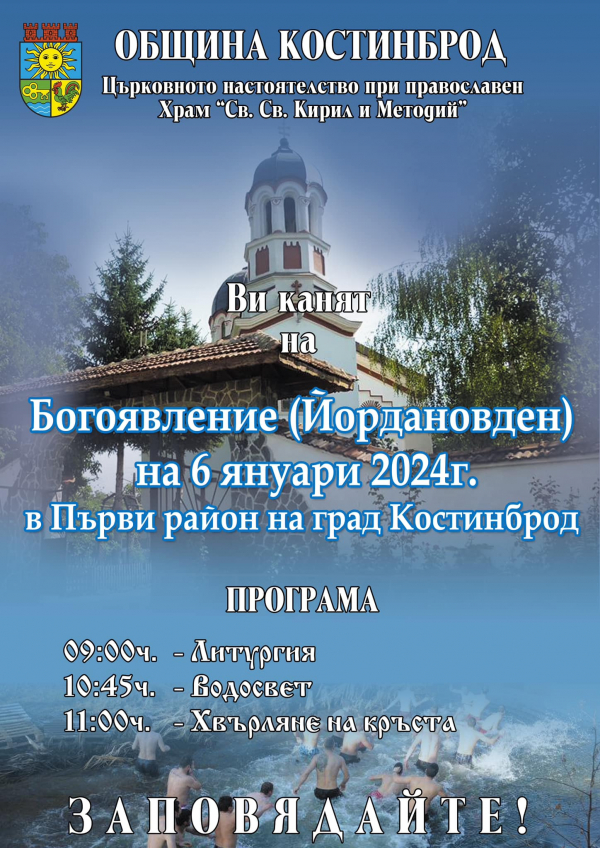Община Костинброд кани всички жители и гости на града да се включат в честването на празника и ще очаква младежи, готови да скочат в ледената вода за здраве и благополучие. Записване за участие в ритуала ще се извършват на място, в същия ден.