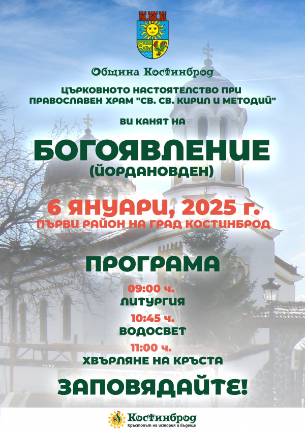 Община Костинброд кани всички жители и гости на града да се включат в честването на празника и ще очаква младежи, готови да скочат в ледената вода за здраве и благополучие.