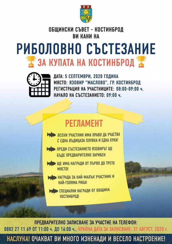 На 5 септември ще се проведе тазгодишното Риболовно състезание за купата на Костинброд. Организатори отново са ОбС-Костинброд, Община Костинброд и Ловно-рибарско дружество „София-Запад“.