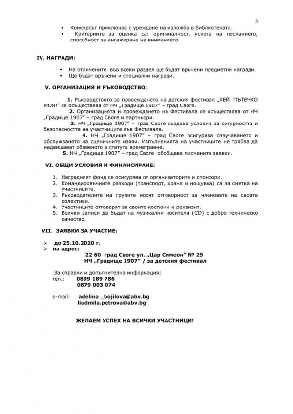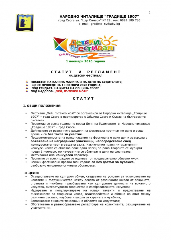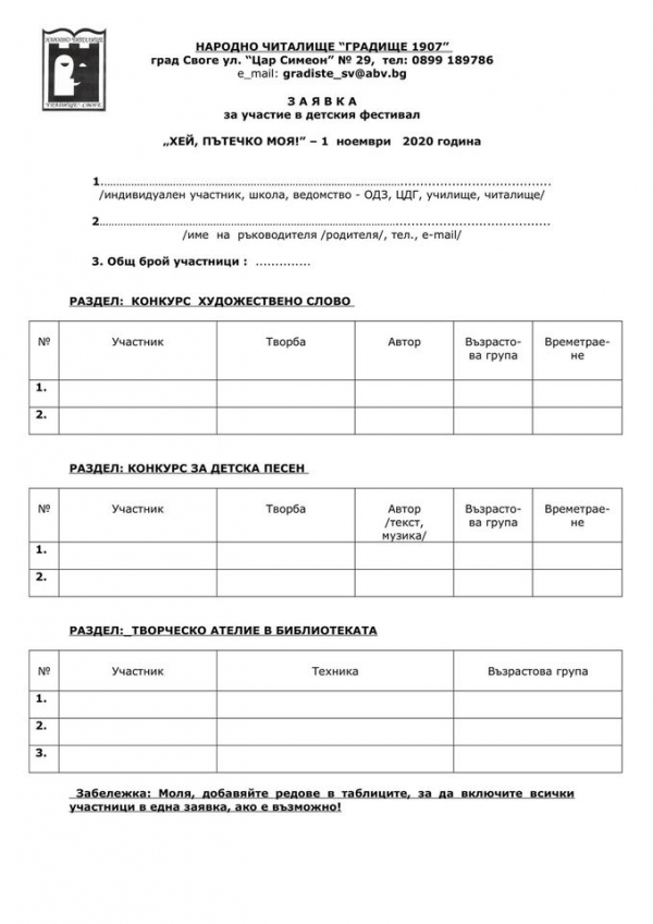 Заявки за участие се приемат до 25 октомври 2020 г. на адрес: 2260 гр. Своге, ул. „Цар Симеон” № 29, НЧ „Градище-1907“, за детския фестивал. На същия адрес до 20 октомври 2020 г. се изпращат творбите за участие в литературния конкурс. За справки и допълнителна информация: тел.: 0899 189 786; 0879 003 074; e-mail: liudmila.petrova@abv.bg; adelina_bojilova@abv.bg.