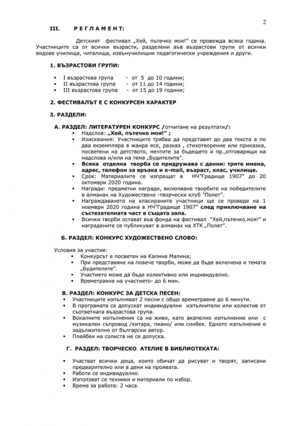 Фестивалът има конкурсен характер и се провежда в четири раздела: литературен конкурс, художествено слово, детска песен и творческо ателие. Децата, които ще премерят дарбите си, ще бъдат разделени в три възрастови групи: от 5 до 10 години; от 11 до 14 години; от 15 до 19 години.