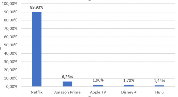 Netflix е не само водещата платформа по брой на абонати, но и най-популярната услуга за стрийминг, използвана като примамка от киберпрестъпниците. Общо 89,93% от засегнатите потребители се сблъскват със злонамерен или нежелан софтуер, докато търсят платформата Netflix и свързано с нея съдържание.