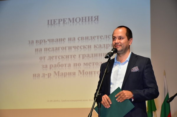 В рамките на церемонията кметът Калин Каменов и директорът на Нов български университет проф. д-р Пламен Бочков връчиха дипломите за работа по метода „Монтесори“ на 15 педагози. През новата учебна година в общо 6 детски градини - в 10 групи/ 3 яслени и 7 целодневни/ ще работят по съвременния метод. Прилагането на алтернативния начин на обучение се реализира в детските градини: „Слънце”, „Щастливо детство”, „Славейче”, „Европейчета”, „Детски свят“ и „Знаме на мира“.