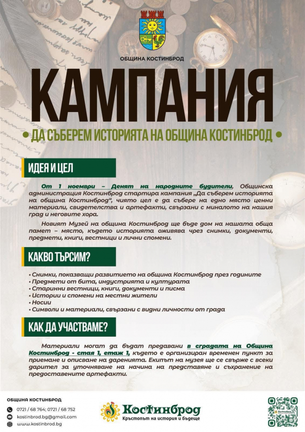 Припомняме, че от 1-ви ноември 2025 година общинска администрация – Костинброд стартира кампания „Да съберем историята на Костинброд“, чиято цел е да открие и събере на едно място ценни материали, свидетелства и артефакти, свързани с миналото на нашия град и жителите в него.