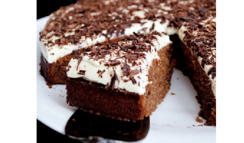 Намажете изстиналия кейк с крема. Декорирайте отгоре с настърган на едро черен шоколад или може да поръсите с малко какао.