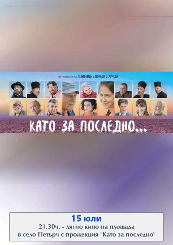 Кино на открито в с. Петърч на 15 юли 12.07.2022 11:16:00 957 преглеждания На 15 юли от 21.30 ч.- на площада в село Петърч ще се прожектира “Като за последно”, съобщават от Община Костинброд. Входът е свободен. Източник: Община Костинброд EspressoNews Тагове кино кино на открито Костинброд община Костинброд Община Костинброд Петърч