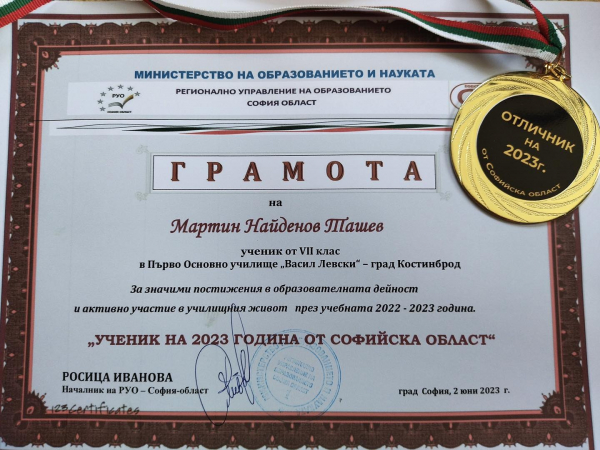Още един повод за гордост имаше костинбродското училище от Годишните награди на РУО – София област. В категорията „Ученик на 2023 година от Софийска област“, седмокласникът Мартин Ташев взе почетният приз, за значими постижения в образователната дейност и активно участие в училищния живот през учебната 2022-2023 година.