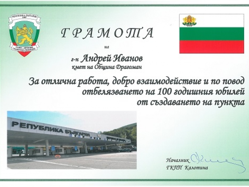 Кметът на община Драгоман Андрей Иванов бе отличен с грамота в рамките на събитието, с което настоящи и бивши митнически служители отбелязаха 100-годишнината от създаването на граничен и митнически пункт Калотина.