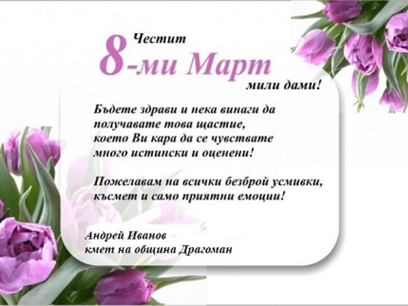 Кметът на община Драгоман Андрей Иванов, отправи специално поздравление по повод Осми март - Международния ден на жената. Приветствието е публикувано на официалния сайт на Общината. Ето и пълния му текст: