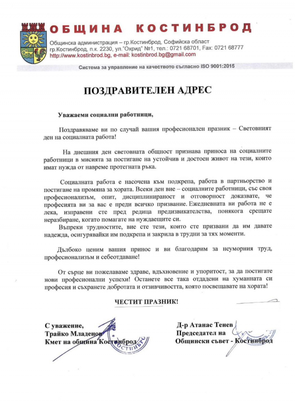 С поздравителен адрес, кметът на Костинброд – Трайко Младенов и Председателят на ОБС-Костинброд – д-р Атанас Тенев, се обърнаха към социалните работници в общината, за Световния ден на социалната работа. Приветствието е публикувано на официалната Фейсбук страница на Общината: