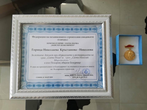Горица Кръстанова - кмет на село Пожарево, община Божурище, бе отличена със златна значка „Майстор Кольо Фичето“ на Федерацията на независимите строителни синдикати в град София. Значката и почетна грамота й връчиха членовете на управителния съвет на Федерацията за заслуги и принос във възстановяването на двата християнски храма в село Пожарево - храм „Свети Николай Мирликийски“ и храм „Свети Илия“.