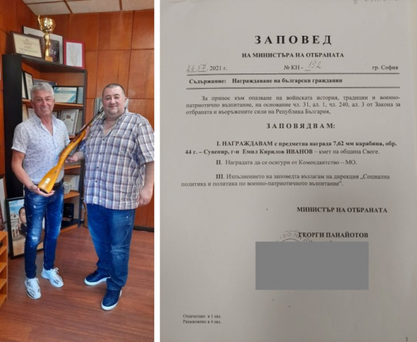 Със Заповед № КН-192 / 26.07.2021 г. на Министъра на отбраната на Република България, кметът на община Своге - Емил Иванов бе награден с предметна награда - 7.62 мм карабина, обр. 44 г., за принос към опазване на войнската история, традиции и военно-патриотично възпитание.