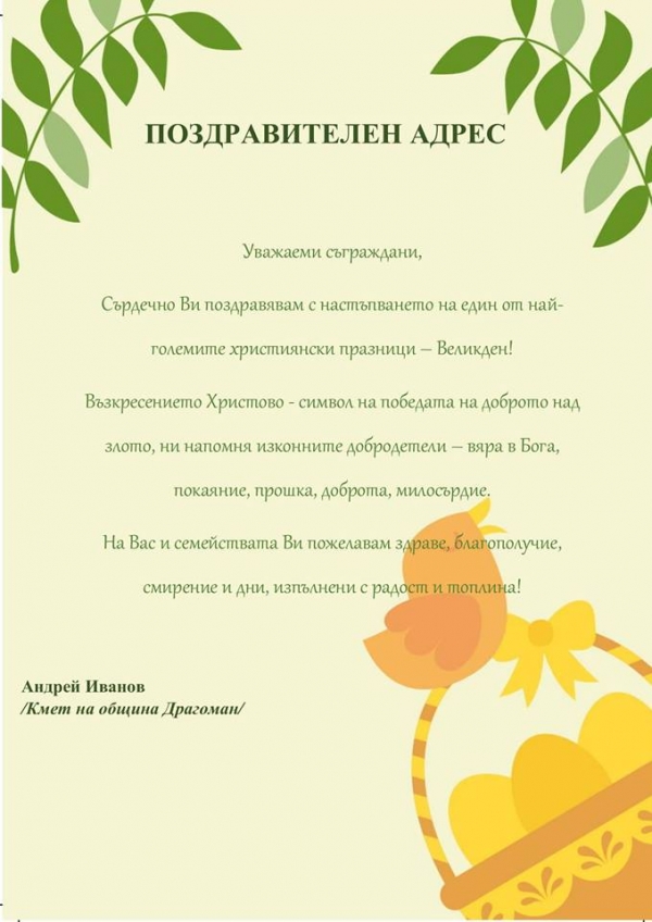 В специално приветствие по повод големия християнски празник Великден, кметът поздрави своите съграждани и жители на общината по повод празника, напомняйки за неговата значимост и ценостти, които носи и към които трябва да се стремим.
