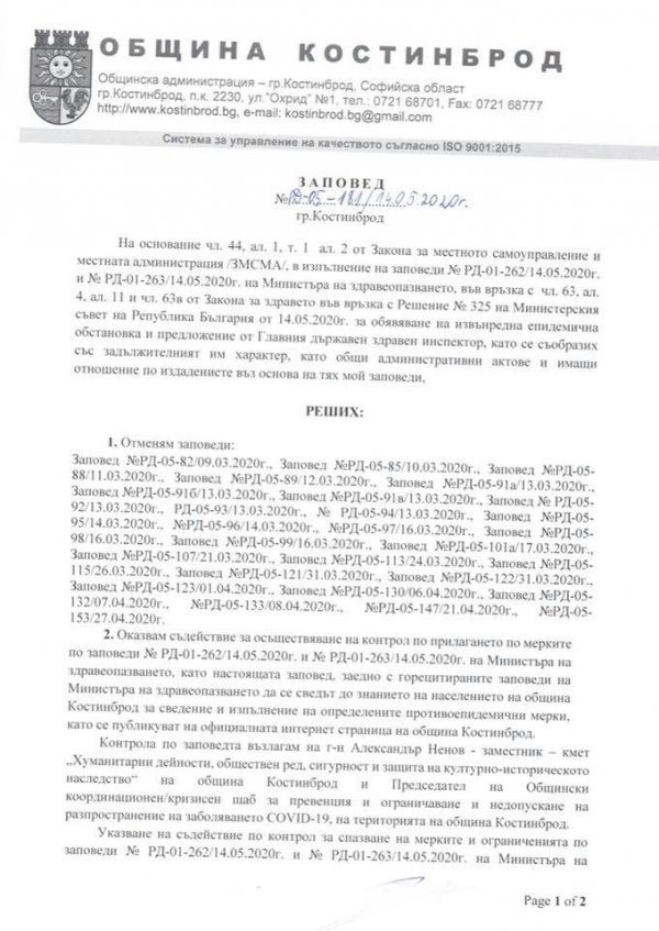 Кметът на община Костинброд издаде заповед РД-05-181/14.05.2020г., в изпълнение на заповеди № РД-01-262/14.05.2020г. и № РД-01-263/14.05.2020г. на Министъра на здравеопазването, във връзка с чл. 63, ал. 4, ал. 11 и чл. 63в от Закона за здравето във връзка с Решение № 325 на Министерския съвет на Република България от 14.05.2020г. за обявяване на извънредна епидемична обстановка и предложение от Главния държавен здравен инспектор, като е съобразено със задължителния им характер, като общи административни актове и имащи отношение по издадениете въз основа на тях заповеди на кмета на община Костинброд.