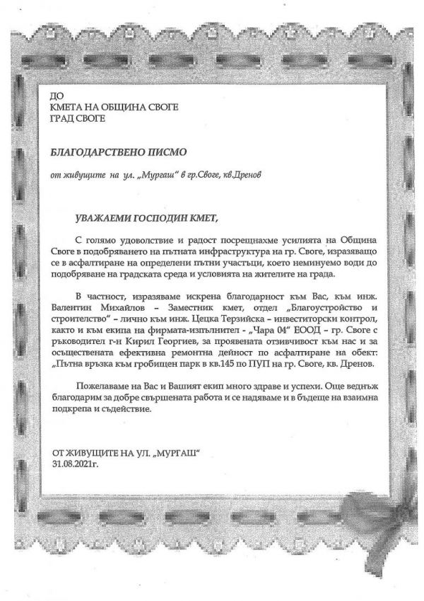 Кметът на община Своге Емил Иванов получи благодарствено писмо от живущите на ул. „Мургаш“,  кв. „Дренов“, гр. Своге, за подобряване на пътната инфраструктура на града. Благодарственото писмо е публикувано на официалния сайт на Община Своге:
