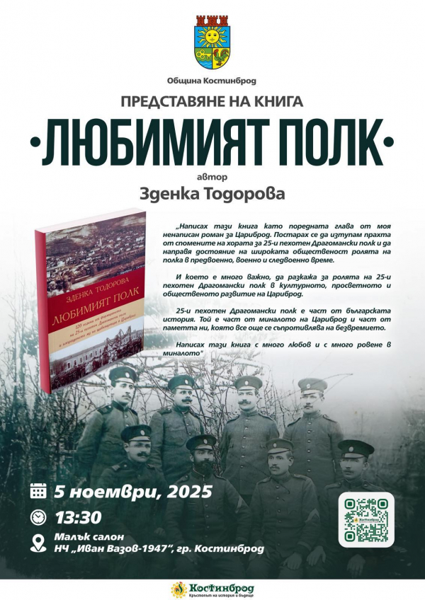 На 5 ноември 2025 г. от 13:30 ч. в малкия салон на Народно читалище „Иван Вазов – 1947“ в гр. Костинброд ще се състои официалното представяне на книгата „Любимият полк“ – най-новото издание на журналистката и писателка Зденка Тодорова.