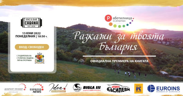 На 13.06.2022 г. (понеделник), в кино „Кабана“ в София, ще се състои официалната премиера на книгата „Разкажи за твоята България“. Събитието, което е с начален час 18.30 часа, се провежда с подкрепата на Столична община – Лятна програма и е част от културния календар на Столицата за 2022 г.