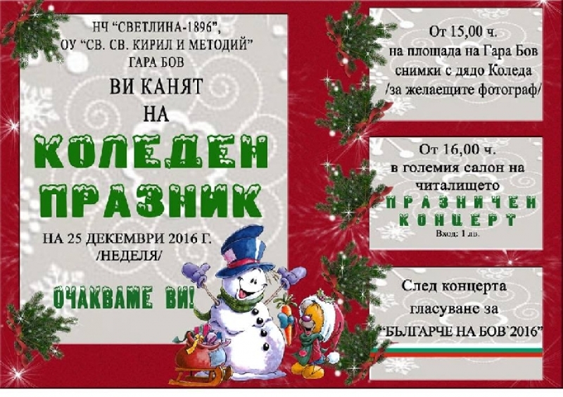 НЧ "Светлина-1896" и ОУ "Св. Св. Кирил и Методий" са организират Коледен празник, който ще съчетае в себе си снимки с белобрадия старец - Дядо Коледа, Празничен концерт, който ще се състои в големия салон на читалище от 16:00 ч., а веднага след него ще се проведе и гласуването в третото издание на инициативата "Българче на Бов 2016", за която EspressoNews писа.