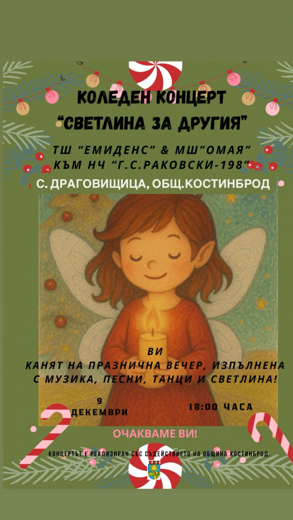 Танцова школа „Емиденс“ и музикална школа „Омая“ към НЧ „Г. С. Раковски – 1928“ (Драговищица) организират празничен коледен концерт под наслов „Светлина за другия“. Събитието ще се проведе на 9 декември от 18:00 часа в салона на читалището.