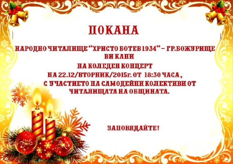 На 22 декември 2015 г. от 18:30 часа в Народно читалище "Христо Ботев 1934" - гр. Божурище ще се състои коледен концерт с участието на самодейни колективи от читалищата на общината.