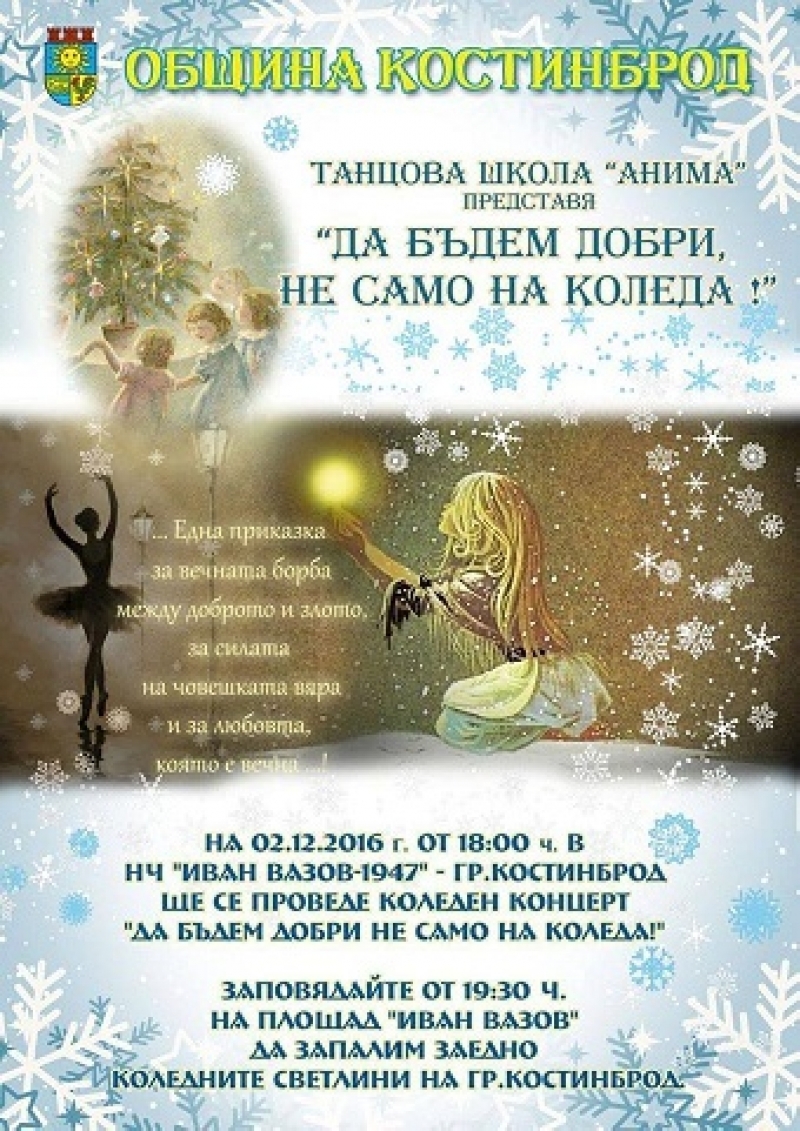 На 02.12.2016 г. от 18:00 ч. в НЧ „Иван Вазов – 1924“, град Костинброд ще се проведе коледен концерт под наслов „Да бъдем добри не само на Коледа“, с участието на Танцова школа „Анима“. След празничният концерт, от 19:30 ч. на площад „Иван Вазов“ ще бъдат запалени коледните светлини в град Костинброд.
