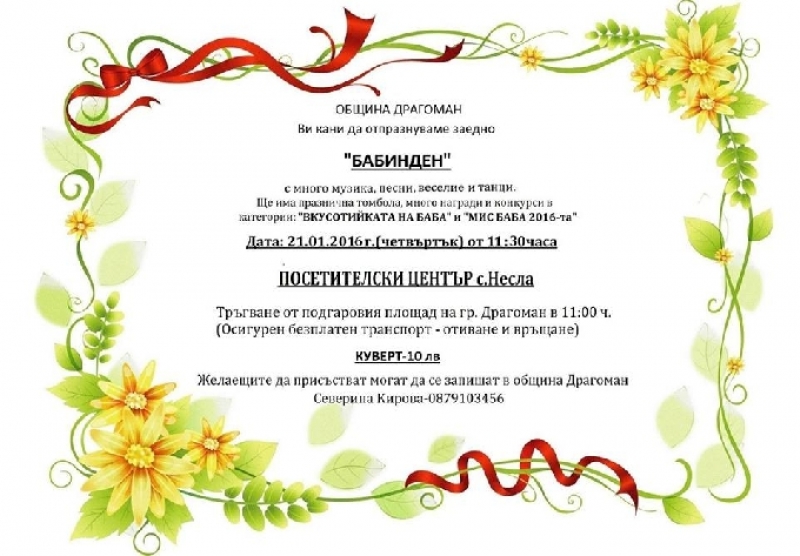 На 21 януари от 11:30 часа в посетителския център на село Несла ще се проведе празненство по случай "Бабинден". В програмата са включени и два конкурса - "Вкусотийката на баба" и "Мис Баба - 2016".