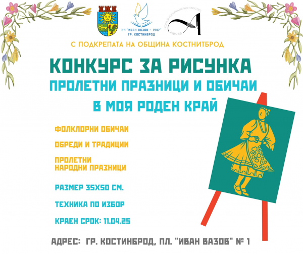 Школа за изобразително изкуство „Акварел“ и НЧ „Иван Вазов 1947“, с подкрепата на Община Костинброд, обявяват конкурс за рисунка на тема „Пролетни празници и обичаи в моя роден край“. Конкурсът е насочен към учениците и има за цел да съхрани и популяризира културното наследство на родния край чрез творчески израз на традициите, свързани с пролетните празници.