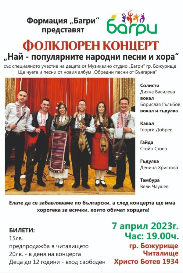 Формация „Багри“ ще зарадва любителите на фолклора в Божурище с концерт „Най-популярните народни песни и хора“. Събитието ще се проведе на 7 април от 19.00 ч., в НЧ „Христо Ботев 1934“.