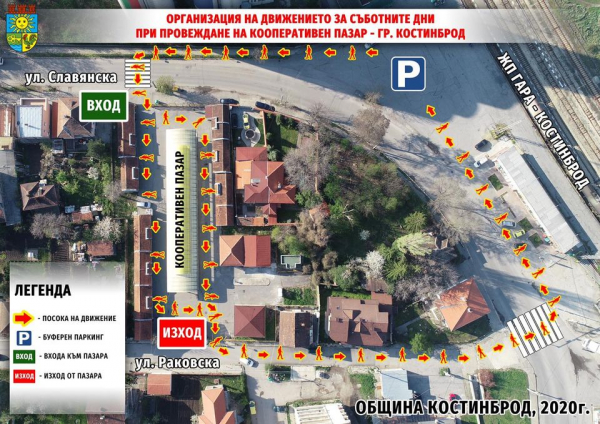 От Община Костинброд предоставят схема за организацията на движението за съботните дни при провеждането на пазара и апелират към всички земеделски производители, търговци на земеделска и фермерска продукция, и всички клиенти за стриктно спазване на мерките и ограниченията от извънредното положение, с цел предотвратяването на разпространението на коронавируса.