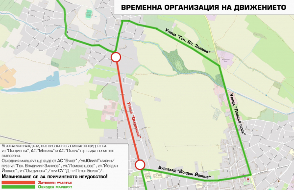 В 09:10 часа тази сутрин на ул. Обединена се взривява къща, вследствие на спукана газова тръба. Обслужването на автобусни спирки „Обора“ и „Могила“ по линии на обществения транспорт се преустановява за неопределено време, считано от 10:15 ч. на 14.06.2024г. /петък/, поради сериозна авария на газопроводна мрежа на ул. „Обединена“ в частта на кв. „Обора“, гр. Костинброд.