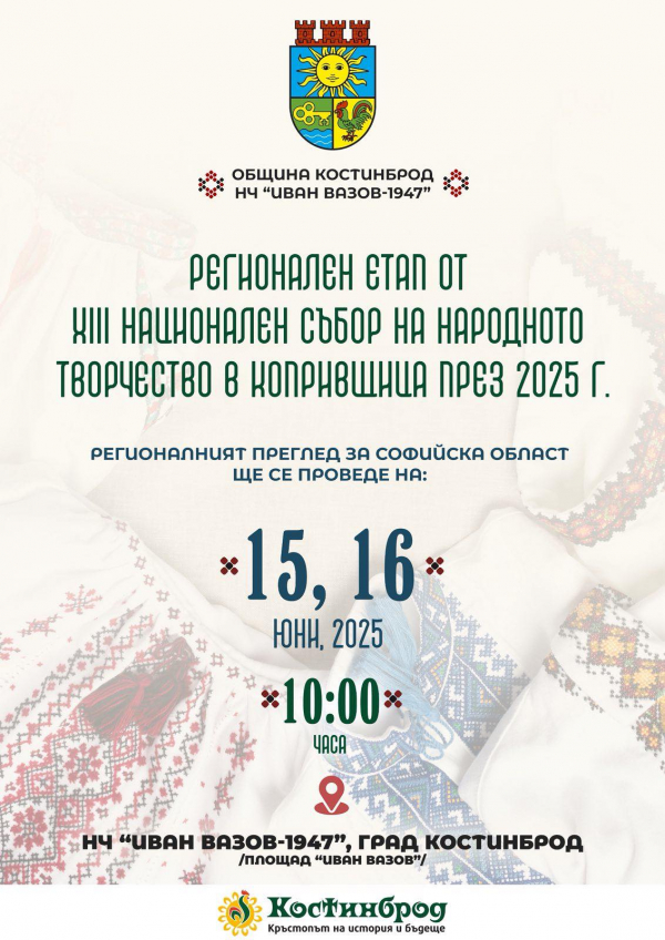 Община Костинброд и НЧ „Иван Вазов 1947“ ще бъдат домакина на регионалния етап за Софийска област от престижния XIII Национален събор на народното творчество, който ще се проведе в Копривщица през 2025 г. Регионалният преглед ще се състои на 15 и 16 юни 2025 г. от 10:00 часа на централния площад „Иван Вазов“ в град Костинброд.