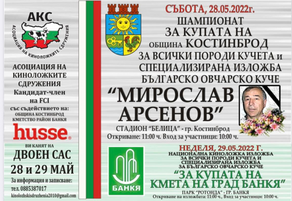 Костинброд ще бъде домакин на шампионат за всички породи кучета - „За купата на община Костинброд“ и специализирана изложба на българско овчарско куче „Мирослав Арсенов“.