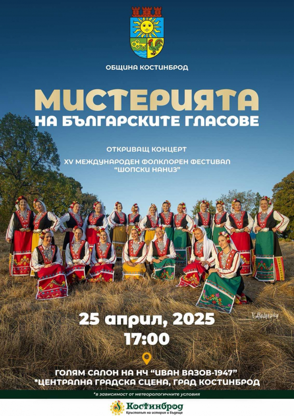 Община Костинброд кани жителите и гостите на града на грандиозното откриване на XV Международен фолклорен фестивал „Шопски наниз“. Събитието ще започне с впечатляващ концерт на световноизвестния женски хор „Мистерията на българските гласове“. Концертът ще се проведе на 25 април 2025 г. от 17.00 ч., като в в зависимост от метеорологичните условия, неговата локация ще бъде големия салон на НЧ „Иван Вазов1947“ или Централната градска сцена в Костинброд.
