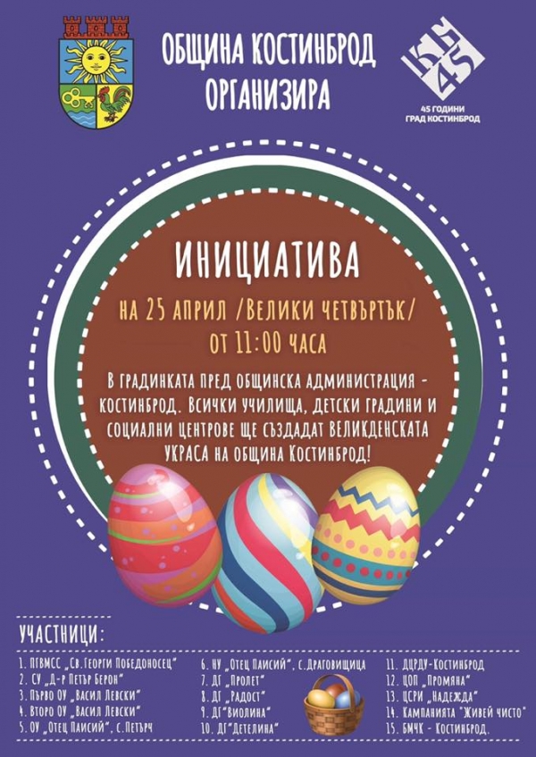 С пъстра украса община Костинброд ще посрещне предстоящите Великденски празници. Деца, родители, учители, потребители на социални услуги в Костинброд и служители в общинската администрация ще се включат в доброволческа акция по създаване на великденска украса в града,  на 25 април от 11:00 ч. в градинката пред Общината.