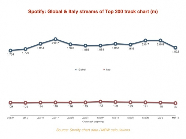 Музикалната индустрия е също толкова засегната от пандемията коронавирус. Множество концерти, турнета и фестивали са отменени за неопределено време. Проучване на Music Business Worldwide сочи, че световното посещение на Spotify’s Top 200 е спаднало с 11% до 226 милиона слушания през седмицата на 13-ти май. Направено е сравнение с Италия, която е най-сериозно засегната държава от Covid-19.