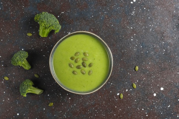 На сутринта прецедете и изсипете блендер с още 300 мл вода, като добавете чесъна и настърганата кора от един лимон. В дълбока тенджера със зехтин задушете нарязания на ситно лук, а щом омекне, добавете броколите и грахта.