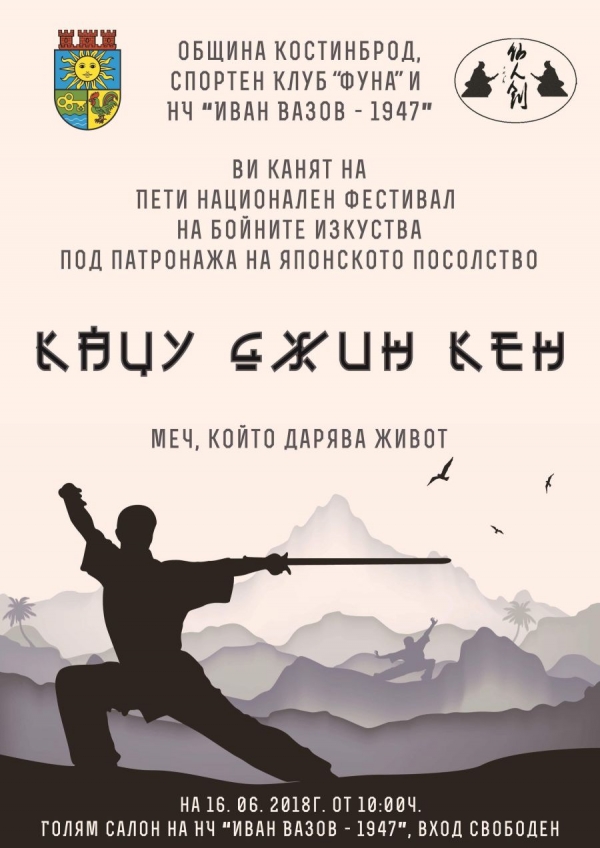 Г-жа Мисаки Нишимура - културно аташе към посолството на Япония в България ще бъде специален гост на националния фестивал на бойните изкуства „Кацу Джин Кен“ (Меч, който дарява живот) в Костинброд. Фестивалът се провежда за пета година, като негови организатори са община Костинброд, спортен клуб „Фуна“ и НЧ „Иван Вазов“.