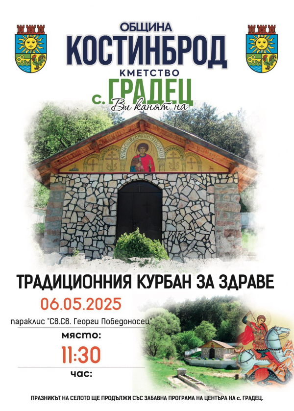 Празничният ден ще започне с тържествена литургия в параклиса „Св. Георги Победоносец“, след което ще бъде раздаден курбан за здраве и благополучие. Събитието е организирано с подкрепата на Община Костинброд и Кметство Градец и се очаква да събере жители, потомци и гости на селото за съвместно честване на този светъл празник. Празничната атмосфера ще продължи и след обредната част – в центъра на живописното село ще има забавна програма, изпълнена с музика, веселие и добро настроение за всички възрасти.