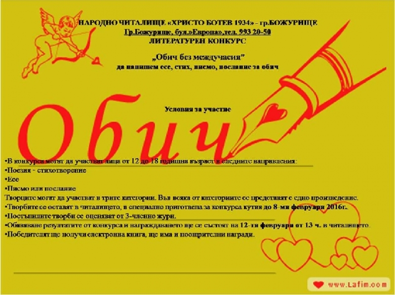 Народно читалище "Христо Ботев 1934" - гр. Божурище организира литературен конкурс на тема "Обич без междучасия". Три са категориите в конкурса - поезия, есе и писмо или послание.