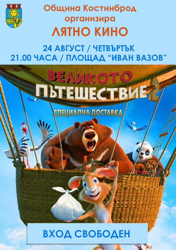 Община Костинброд ще зарадва най-малките си жители и техните семейства с лятно кино и анимацията „Великото пътешествие 2“. Прожекцията е на 24 август от 21.00 часа, на площад „Иван Вазов“ в Костинброд.