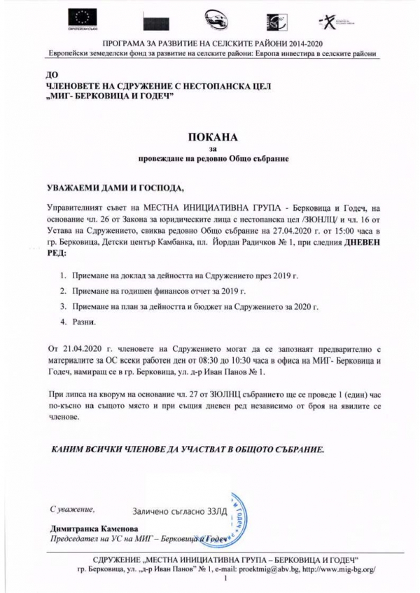 Община Годеч публикува покана за Общо събрание към членовете на сдружение с нестопанска цел "МИГ - БЕРКОВИЦА И ГОДЕЧ".
